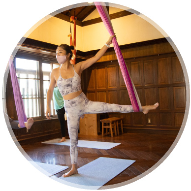 また、もっと幅広いレッスンが行えるよう、国際フローティングヨガ協会認定のエアリアルヨガ指導者の資格も取得し、ハンモックを用いたヨガのレッスンも可能となっています。